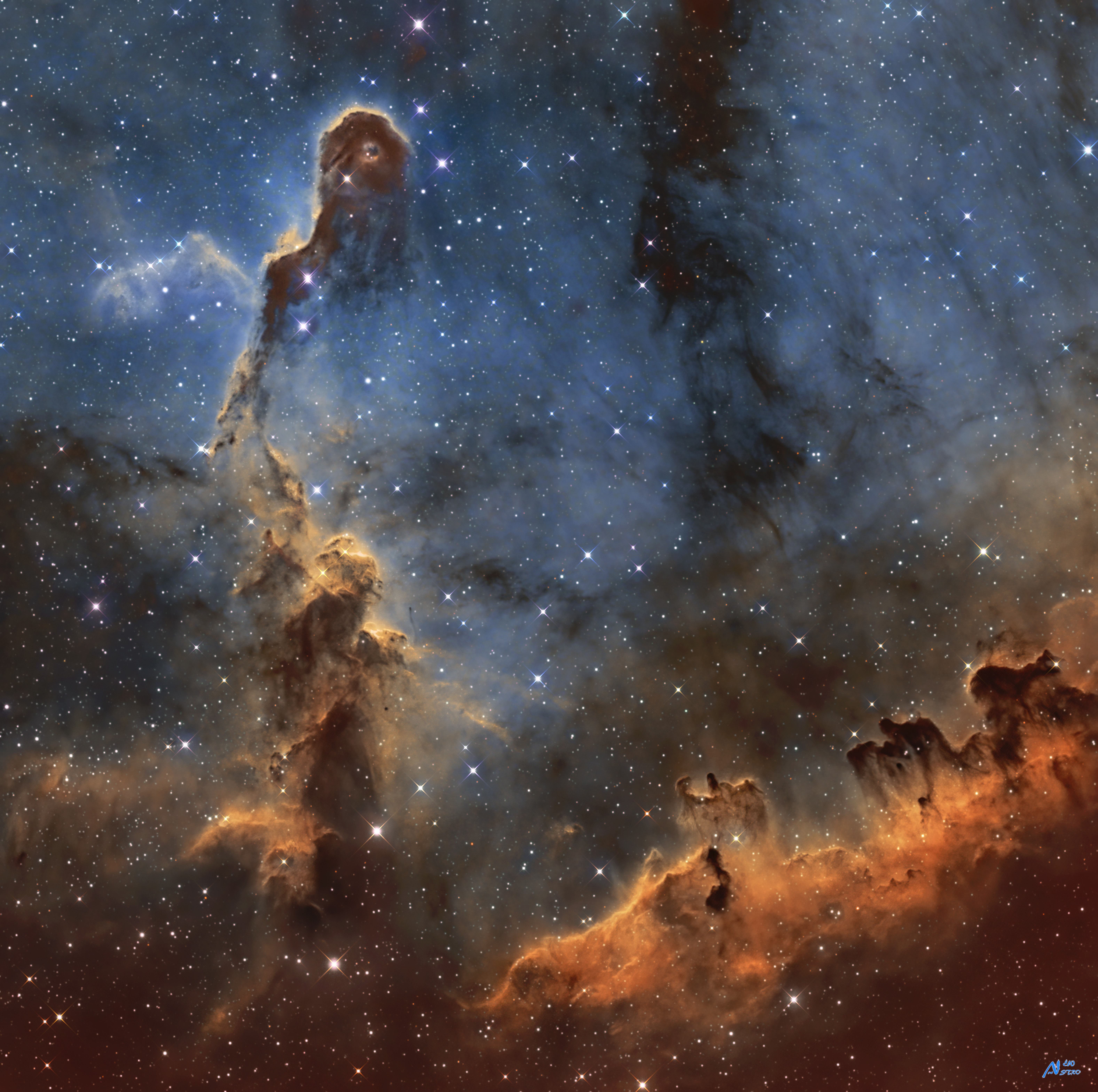 La Trompe de l’Éléphant est parfaitement reconnaissable à sa forme. C’est une nébuleuse obscure contenue dans la nébuleuse par émission IC 1396, elle même immergée au cœur d’un jeune amas stellaire.