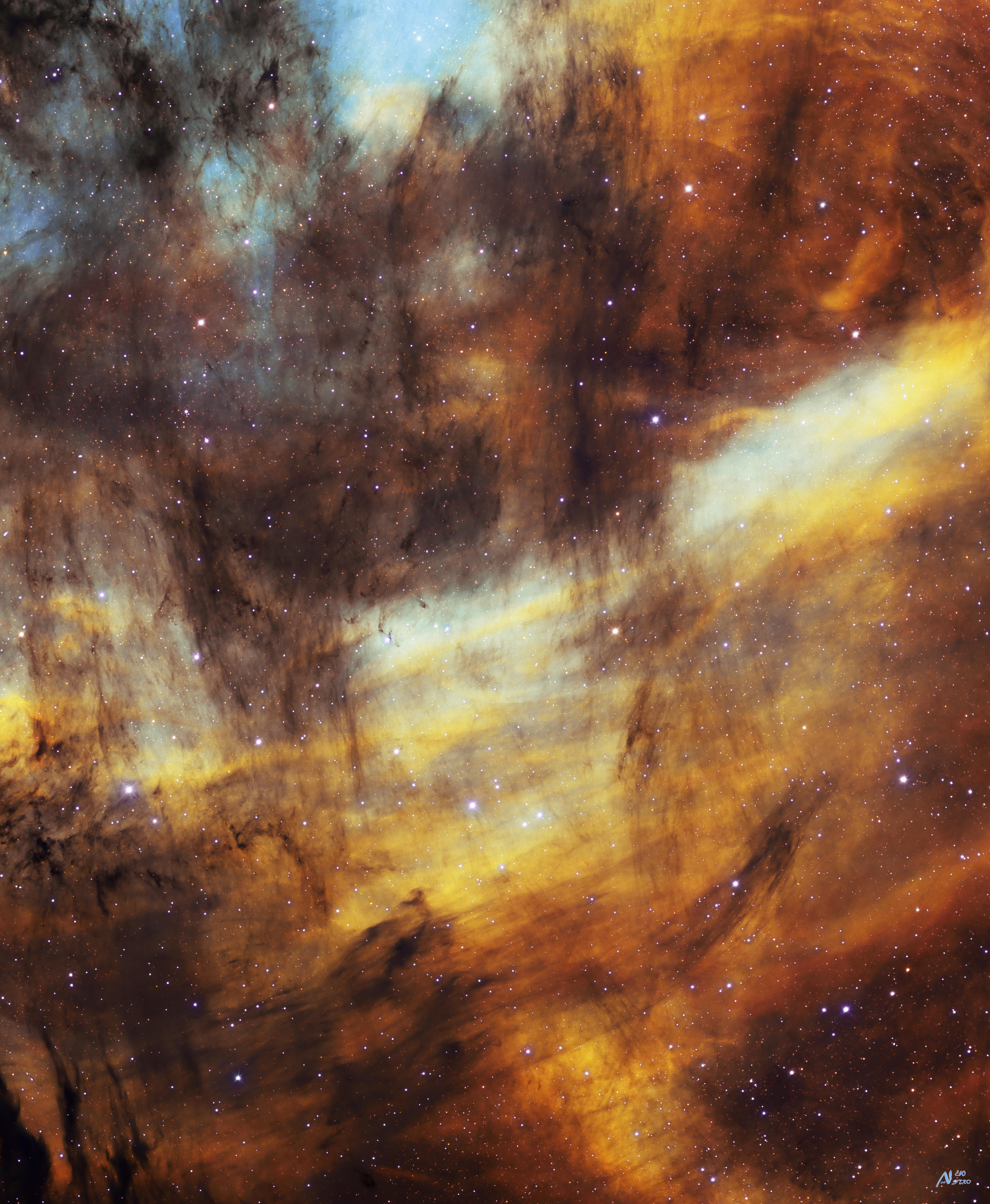 La nébuleuse est surtout connue pour les traînées de nuages sombres qui séparent les régions d’hydrogène colorées, qui séparent également la nébuleuse de ses voisins les plus connus. (Tous sont situés à 1 600 années-lumière dans la constellation du Cygne.)