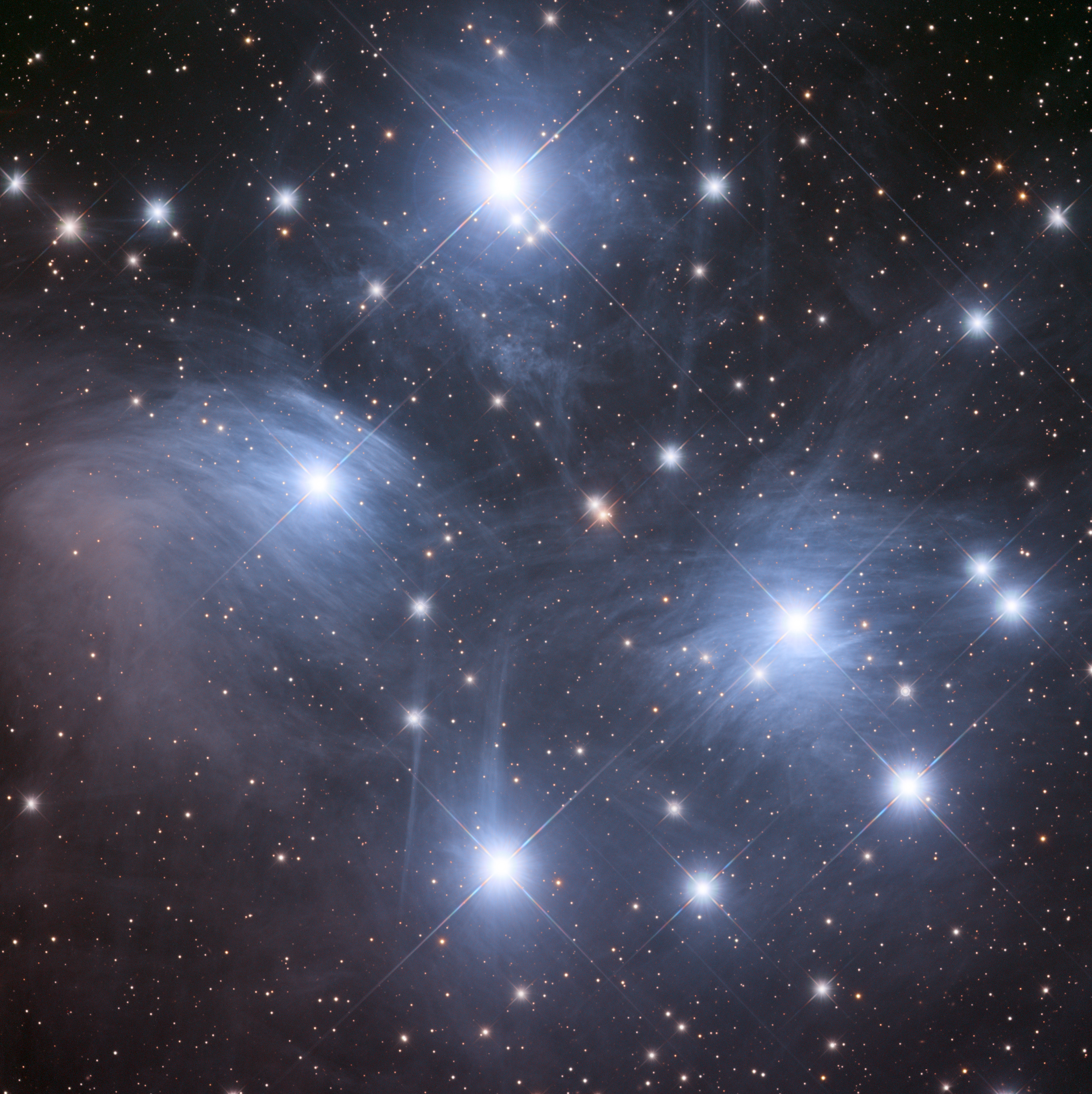 Les Pléiades, aussi désignées Messier 45 (M 45), s’étendent sur quelque 15 années-lumièreà approximativement 430 années-lumière. Elles sont nées, dans leur ensemble, il y a environ 100 millions d’années. Au cours des prochaines 250 millions d’années, ces bébés étoiles vont s’éparpiller dans la Galaxie. Ses étoiles les plus brillantes sont des géantes bleues très chaudes, de classe B. Des astres plus petits et plus pâles que notre Soleil y brillent aussi : des naines rouges ainsi que des naines brunes. Sans oublier que beaucoup des étoiles sont doubles. Et, plus étonnant, des naines blanches y ont été observées.
