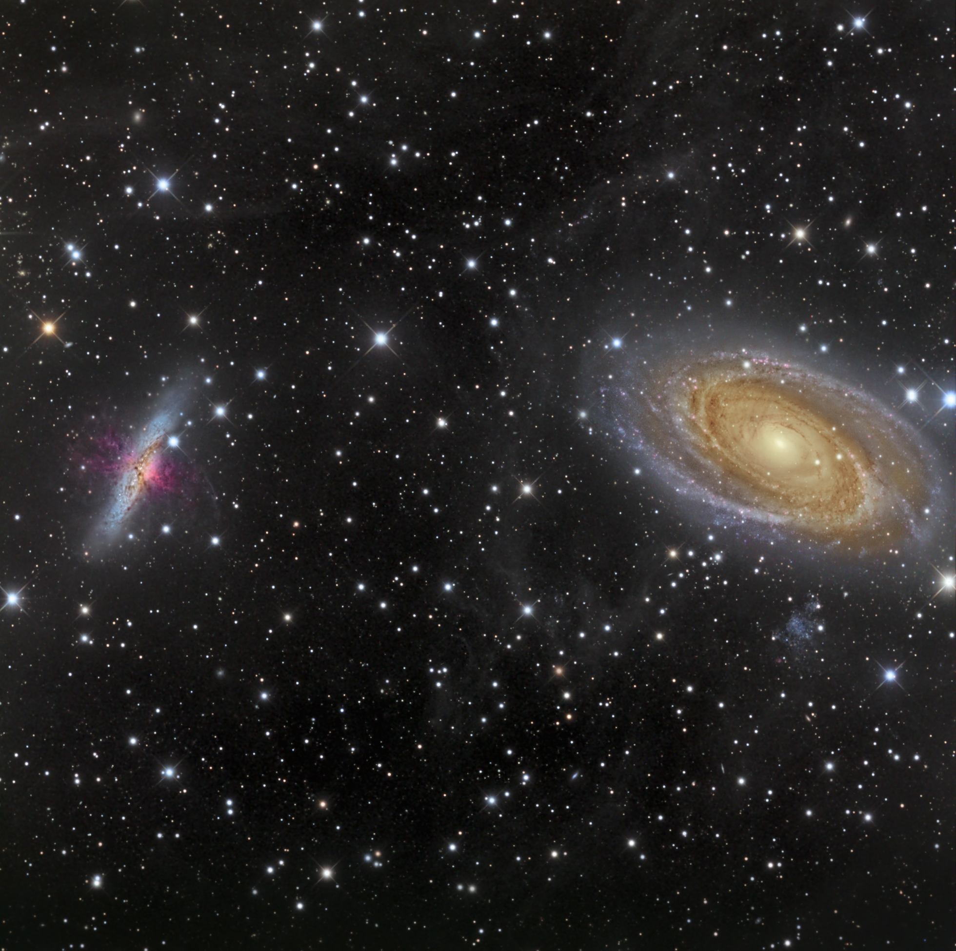 Découverte par Johann Elert BODE en 1774, ce duo de galaxies est situé dans la constellation de la Grande Ourse et il est situé à 11 millions d’années lumières du système solaire, ce qui en fait des galaxies les plus proche de la notre.