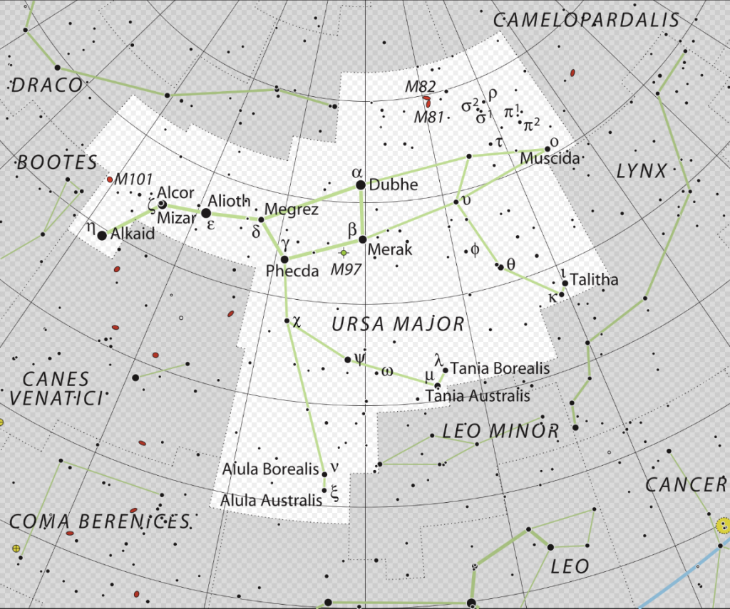 M 81 est une galaxie spirale barrée de petit diamètre avec seulement 60 000 AL qui se présente de 3⁄4 face, sa magnitude est de 6.9 pour un diamètre apparent de 26.9’ X 14.1’ (minutes d’arc). M 82 aussi appelée galaxie du Cigare est une galaxie du type irrégulière, vue pratiquement de profil. Son noyau semble avoir été déformé par la présence de M81 dans son proche voisinage et il présente des raies sombres. Quand à sa magnitude, elle est de 8.4 pour un diamètre apparent de 9’ X 4’ (minutes d’arc). Enfin elle est située à 45’ au nord de M 81.