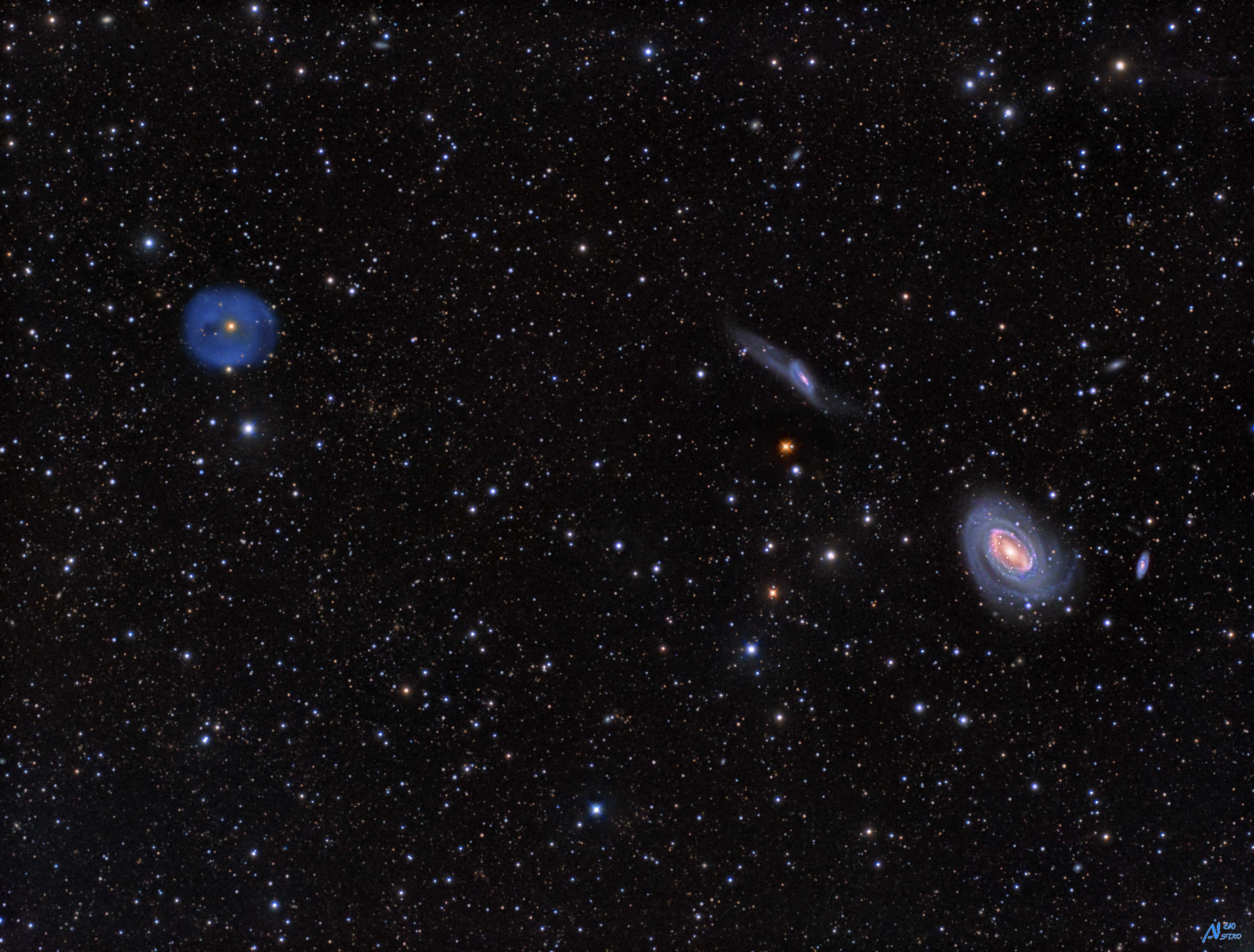 Légèrement à droite toute petite, vue presque par la tranche Ngc 4712 à une distance presque cinq fois plus éloignée de 200 millions d’années lumière.Son diamètre est de 135000 années-lumiére.