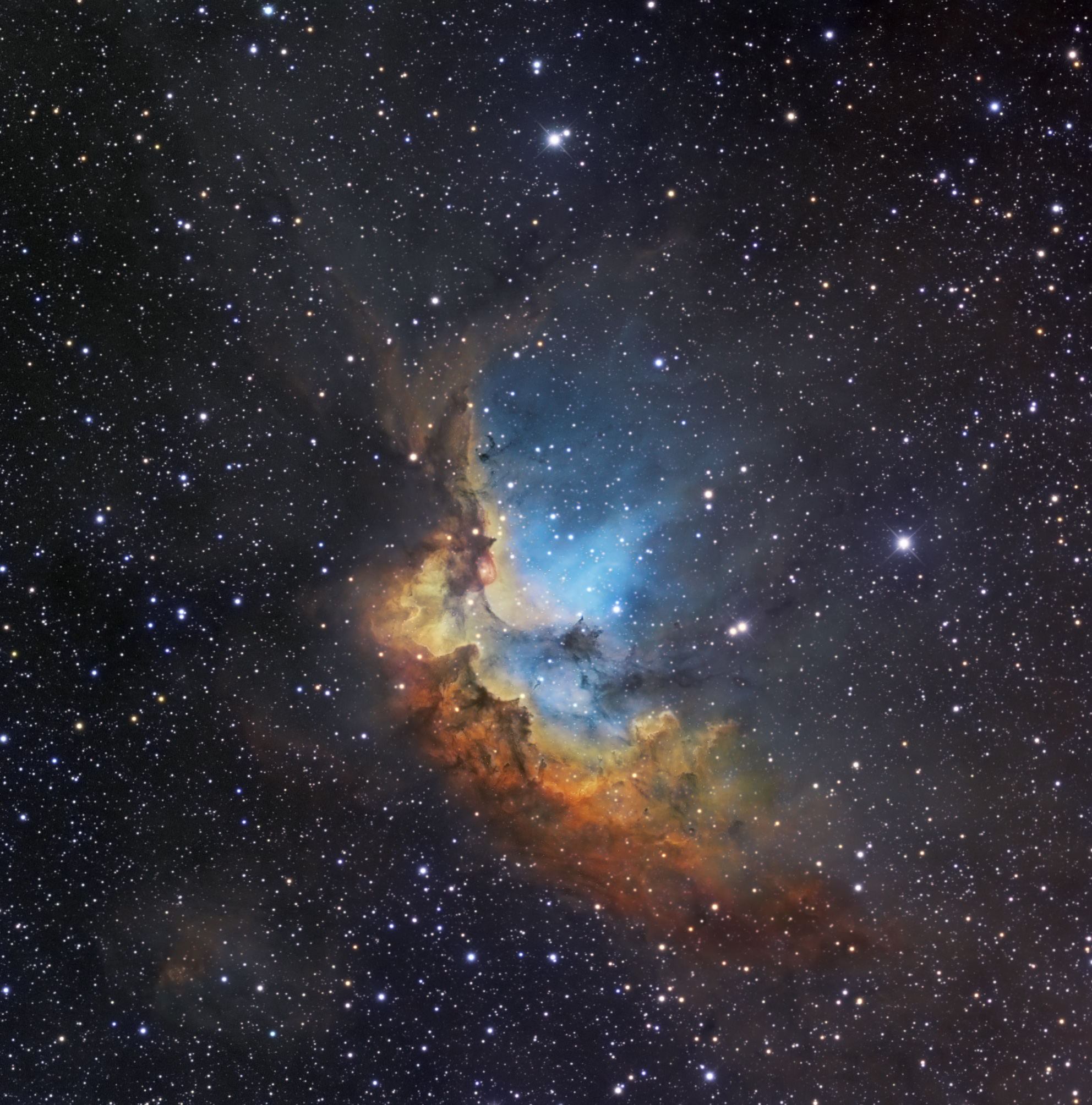 Quelles puissances se manifestent dans la nébuleuse du Sorcier ? La gravitation, suffisamment forte pour former des étoiles, et des vents stellaires et des radiations, assez puissantes pour créer et dissoudre des falaises de gaz. Située à seulement 8000 années-lumière, la nébuleuse du Sorcier entoure l’amas ouvert en développement NGC 7380. Visuellement, le jeu entre les étoiles, le gaz et la poussière a engendré une forme qui pour certains évoque la silhouette d’un sorcier médiéval. La région est active en formation d’étoiles et s’étend sur quelque 100 années-lumière, ce qui dans le ciel terrestre lui donne une taille apparente légèrement plus grande que celle de la Lune. La nébuleuse du Sorcier peut se voir avec un petit télescope dans la constellation Céphée. Bien que cette nébuleuse ait sans doute une espérance de vie ne dépassant pas quelques millions d’années, certaines des étoiles qui s’y sont formées vivront plus longtemps que notre Soleil.