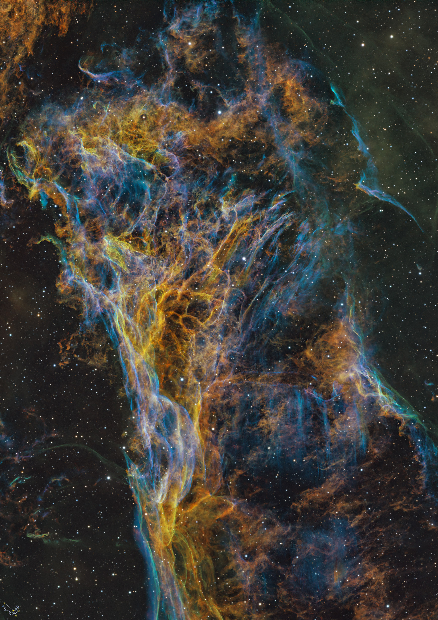 D’apparence chaotique, ces filaments de gaz choqué visibles dans le ciel terrestre en direction de la constellation du Cygne constituent la partie occidentale de la nébuleuse du Voile. Prise dans sa totalité, la nébuleuse du Voile est tout ce qui reste d’une étoile massive de la Voie Lactée. Il y a plus de 5000 ans de cela, cette étoile explosa en supernova. L’onde de choc commença alors à se propager dans le milieu interstellaire, poussant devant elle et ionisant la matière rencontrée en chemin. Il faut considérer ces filaments un peu comme les vaguelettes se formant à la surface d’un étang quand la chute d’une pierre trouble sa surface. Le rayonnement intense de la supernova a par ailleurs ionisé les atomes constituant le matériau interstellaire, l’hydrogène émettant en rouge, le soufre en vert et l’oxygène en bleu lorsqu’ils récupèrent leurs électrons. À cette époque, le nuage en expansion était certainement aussi brillant qu’un croissant de Lune, et resta visible pendant plusieurs semaines. Egalement connue sous le nom de boucle du Cygne, la nébuleuse du Voile s’étend à présent d’une extrémité à l’autre sur un champ apparent de 3°, l’équivalent de 6 pleines lunes. Cela se traduit par un diamètre de 70 années-lumière à la distance estimée de 1500 années-lumière de la Terre. Cette image ne couvre qu’un tiers de ce champ. Appelé Triangle de Pickering selon la tradition qui voulait que les honneurs de la découverte aillent au directeur de l’observatoire, ce complexe triangulaire de filaments devrait en toute justice être connu sous le nom de Volutes de Fleming, du nom de Williamina Fleming, la femme qui en fit réellement la découverte sur une plaque photographique.